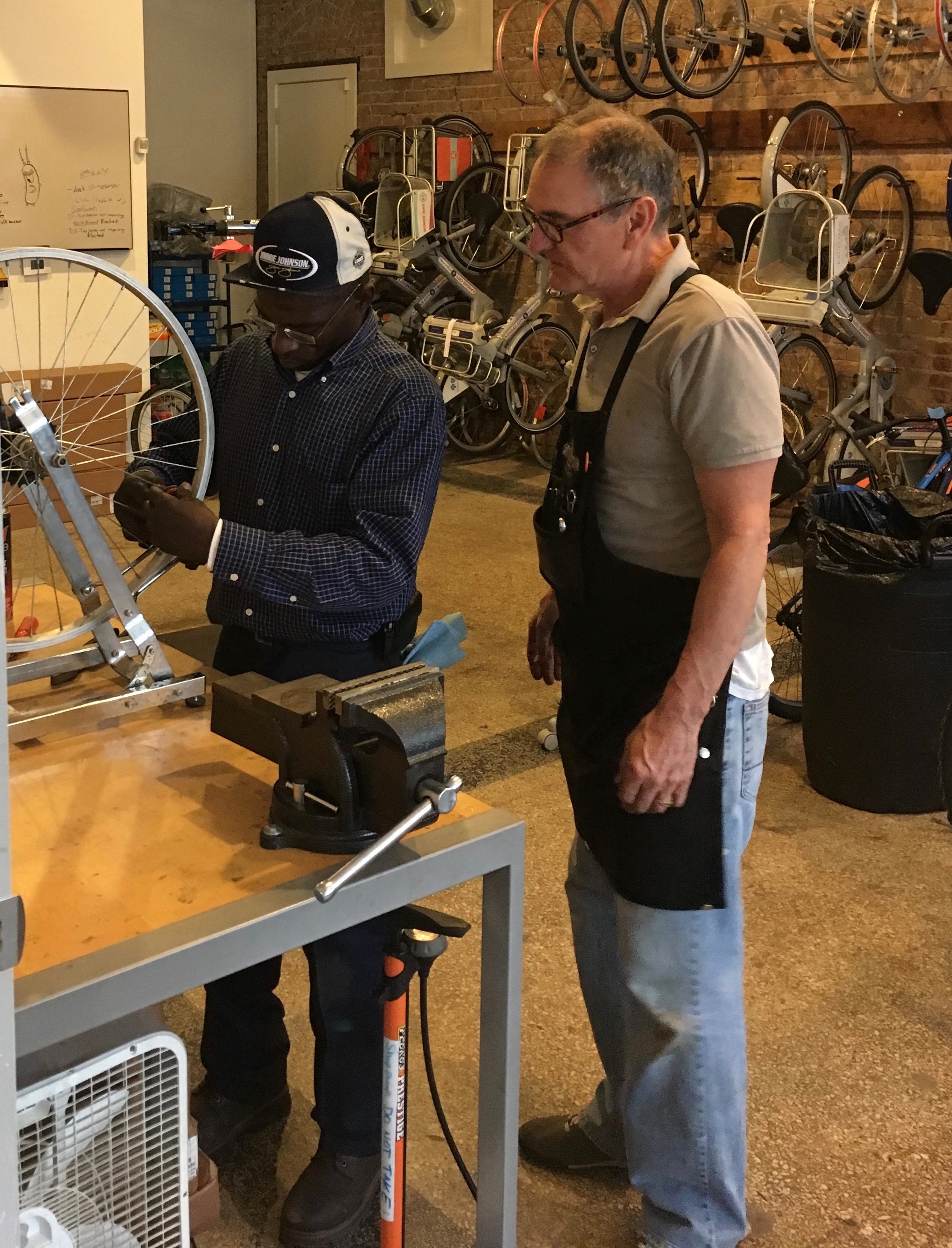 Our adult education partnership with the Hope Faith Ministries (HFM) homeless services organization continues to blossom. After holding adult Earn-A-Bike classes at their facility in 2016, HFM created their own on-site bike repair center, Hope Faith Bike+Works, to service homeless individuals now using bikes to get to work and school opportunities.