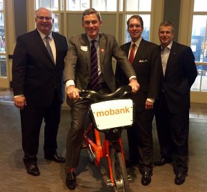 The one-year sponsorship was announced at Mobank’s recent company meeting, held at Union Station in Kansas City, MO. Mobank Chairman Grant Burcham stated, “We are thrilled to have 80 orange Mobank Bikes around town. BikeWalkKC is a signature organization for quality of life in Kansas City, and we are excited about our partnership.”