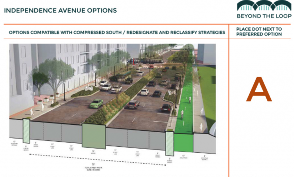 The latter two scenarios would revamp Independence Avenue with a two-way protected cycletrack.