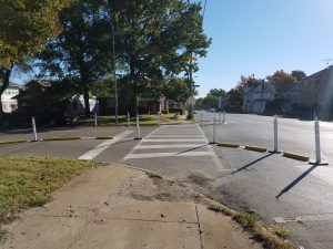 What is the basic formula for creating a safer intersection? Prioritize the most vulnerable road users. That was our goal when we partnered with Children’s Mercy and KCMO Public Works to implement a traffic calming demonstration at Van Brunt and St. John in the Indian Mound neighborhood of Northeast KC last week. This project, along with another week-long traffic calming demonstration kicking off at 10th and Benton tomorrow, is the final segment of Building Collective Health: Community Interventions for Northeast KC, an initiative funded by the Aetna Foundation’s Cultivating Healthy Communities grant.