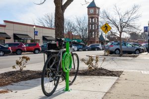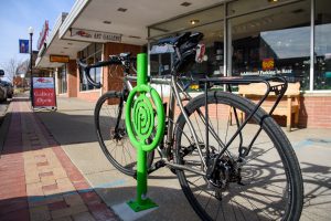 Collaboration of the City of Overland Park, BikeWalkKC, the Downtown Overland Park Partnership, InterUrban ArtHouse, and the Johnson County Department of Health and Environment provides 36 racks across Downtown Overland Park