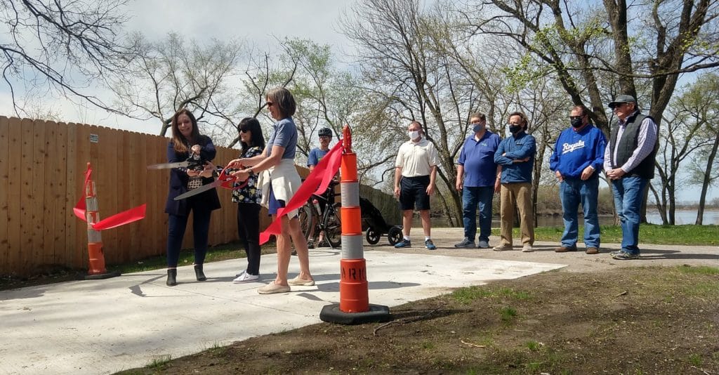 Riverside Mayor Kathy Rose, Parkville Mayor Nanette Johnston, and Platte County Commissioner Dagmar Wood cut the ribbon to open the new trail section on April 9, 2021.
