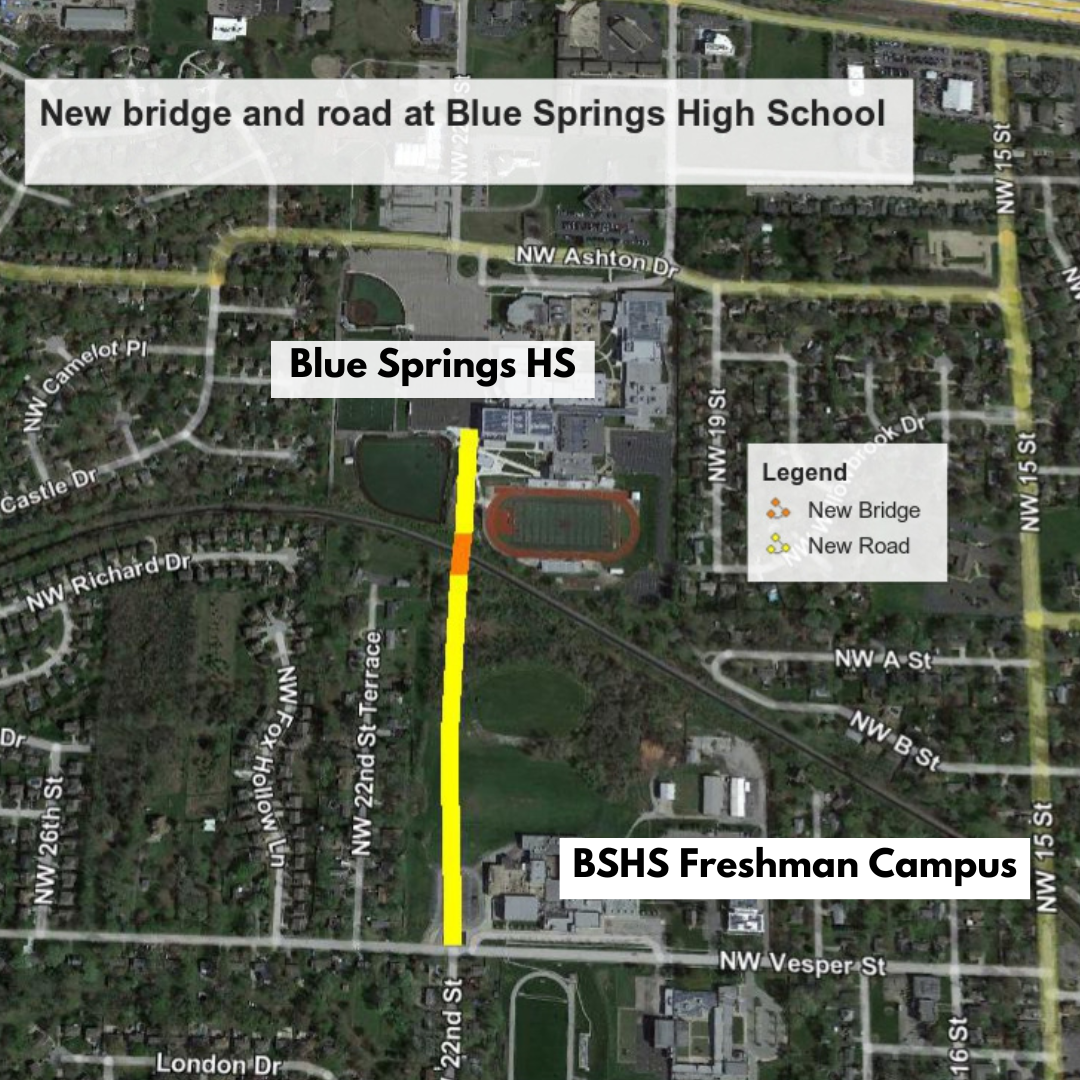 The original plan called for a "street vacation" (also known as a street closure) on the north side of the campus. The modified plan called for a new road and bridge with a sidewalk between Blue Springs High School and the Freshman Campus to the south.