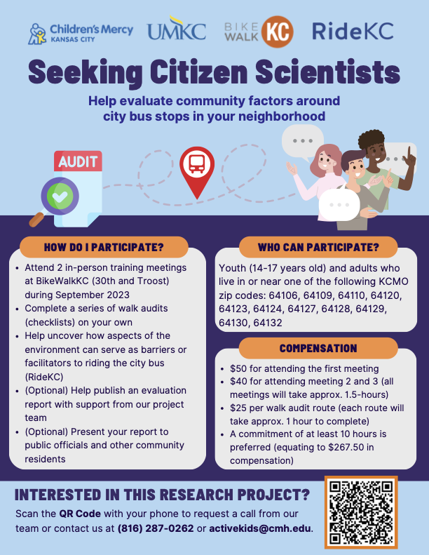 Local researchers looking for youth and/or adults to help gather important data about conditions around bus stops and earn $200 or more this fall. Work with BikeWalkKC’s research partners at UMKC, Children’s Mercy, and RideKC.