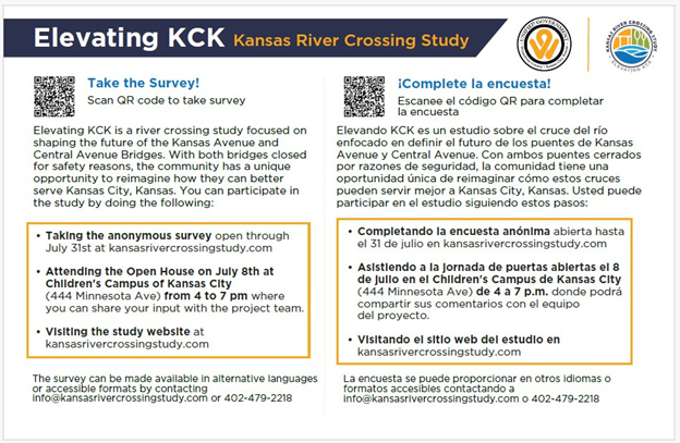 - Elevating KCK is a river crossing study focused on shaping the future of the Kansas Avenue and Central Avenue Bridges