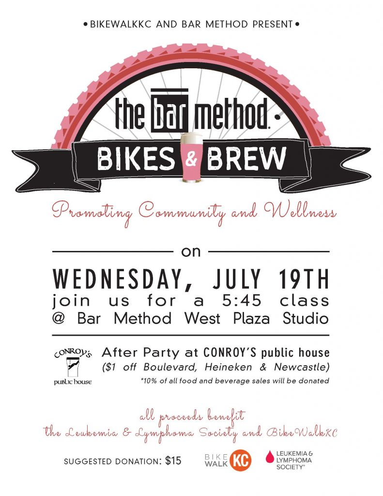 BikeWalkKC and The Bar Method are partnering to offer a special “Bar for Bikers” fitness class, followed by networking at Conroy’s Public House. Class starts at 5:45; a suggested donation of $15 will benefit BikeWalkKC and the Leukemia & Lymphoma Society.