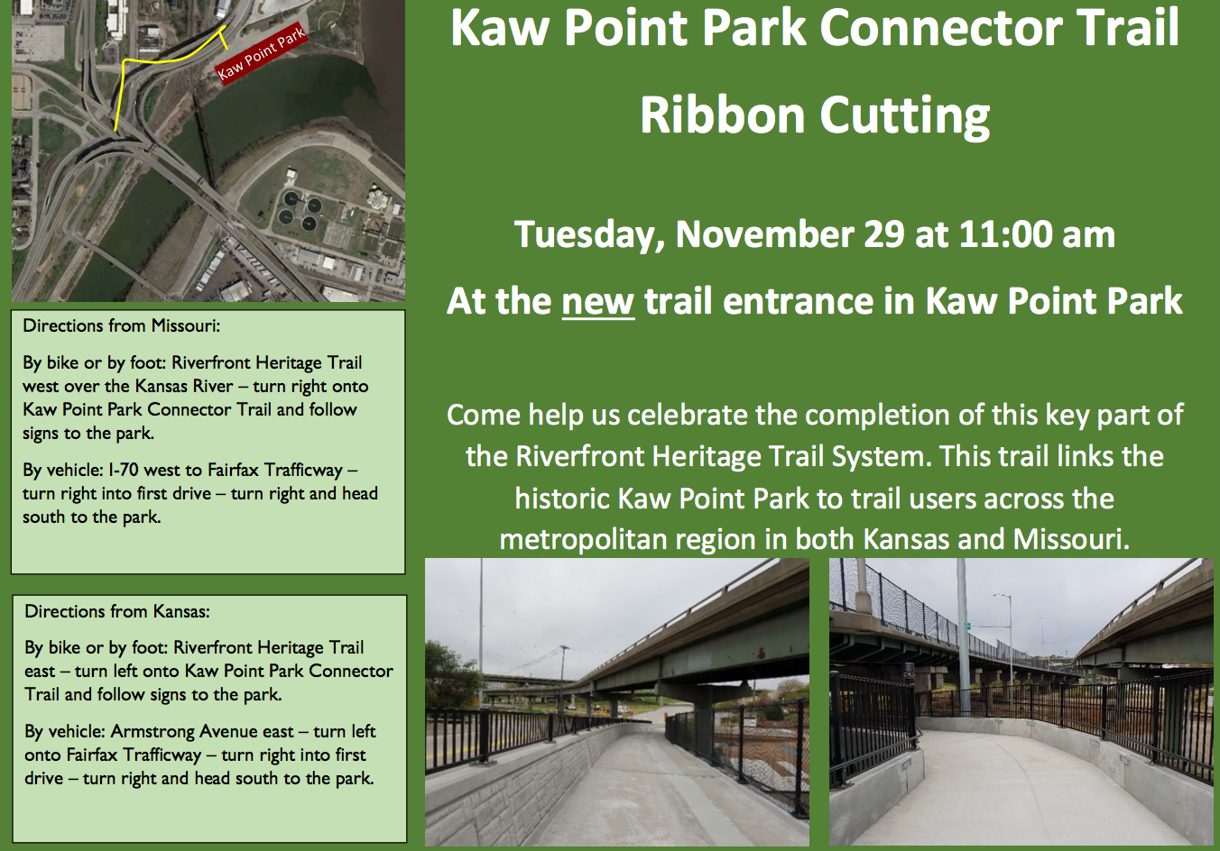 Celebrate the opening of a new trail connector from the Riverfront Heritage to Kaw Point Park in Kansas City, KS. Years in the making, this new connection provides safe and convenient access to the confluence of the Missouri and Kansas Rivers, and great views of both KCK and KCMO.