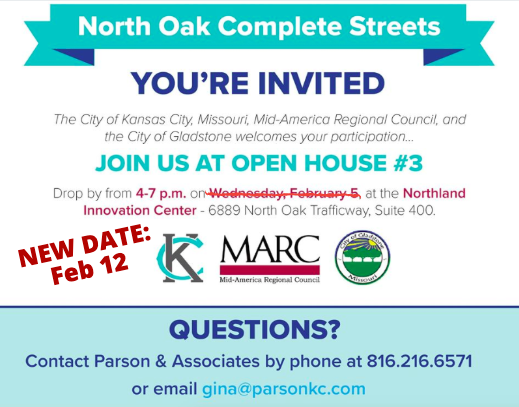 The City of KCMO, Mid-America Regional Council and the City of Gladstone invite you to the third Open House for the North Oak Complete Streets project.