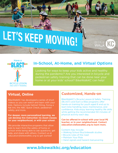 BikeWalkKC’s youth education programs serve an average of 7,000 kids each year in many school districts in the metro and with after-school partners, too. These programs include bike skills and safety classes, Earn-a-Bike programs (includes helmet, lock, and light set), Safe Routes to School services, and Walking School Bus programs. Click here to learn more.
