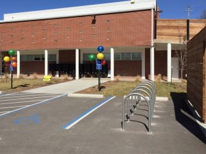 Foutch Brothers LLC completed the renovation of the historic Switzer High School complex into 114 market rate housing units. Located in the Westside neighborhood of Kansas City, the site is ideal for walking and biking. As a part of the developer’s parking plan, BikeWalkKC assisted with navigating the City’s bike parking ordinance and provided technical guidance on the design and location of racks to provide tenants with exceptional bike parking. Fifty-five hoop racks were strategically located in order to maximize use and keep bikes safely secured.