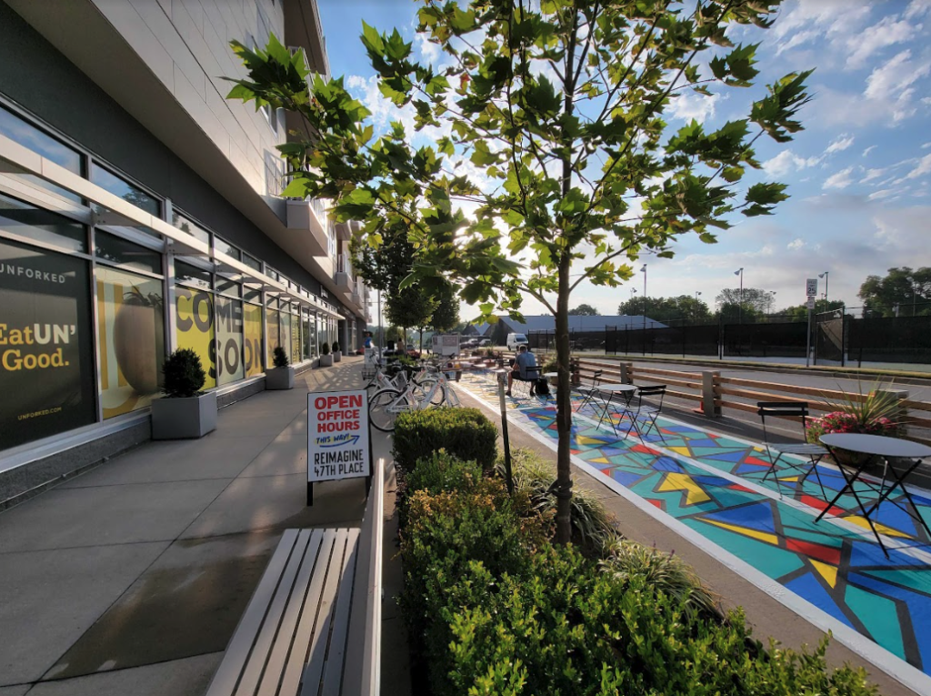 BikeWalkKC hosted a street festival in September 2021 to demonstrate how simple, and often inexpensive, changes can make a tremendous difference in the safety, comfort, and enjoyment of all users. With vibrantly painted and frequently spaced crosswalks, protected bike lanes, street vendors, and attractive seating, BikeWalkKC truly helped community members reimagine 47th Place.