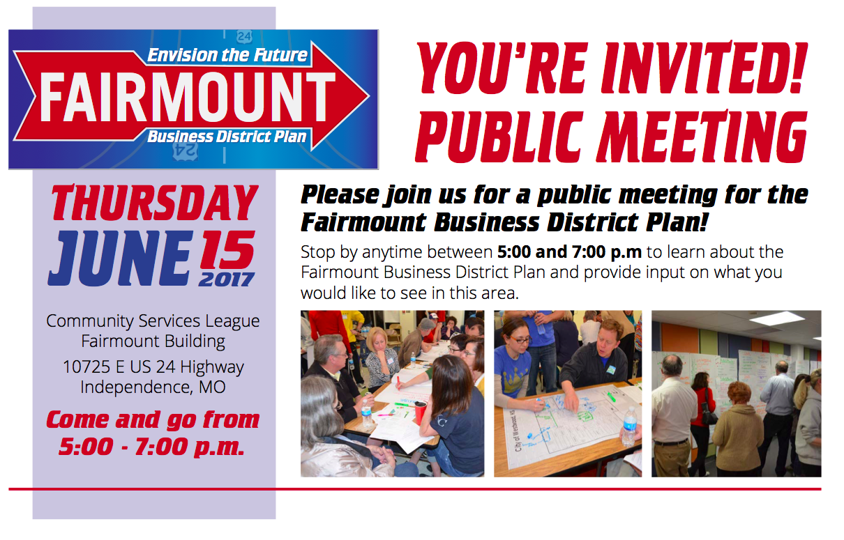 Community Services League Fairmount Building 10725 East US 24 Highway, Independence, MOPlease join the Community Services League for the FINAL PUBLIC MEETING for the Fairmount Business District Plan. Stop by anytime between 4:30-6:30pm to learn about the plan and provide your input about what you would like to see in this area.